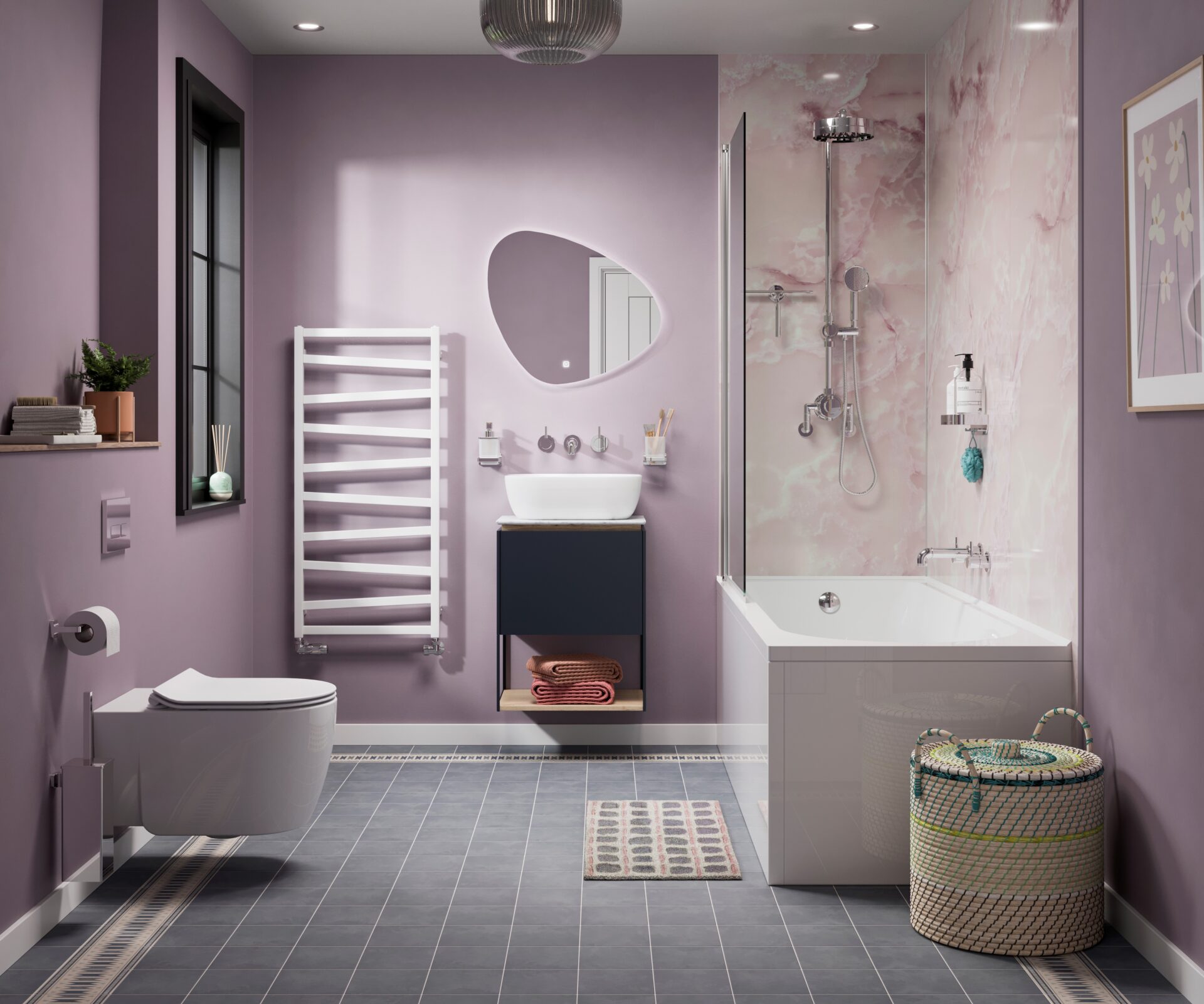 A modern bathroom is defined by clean lines, minimalistic design, and the use of contemporary materials such as glass, stone, and sleek ceramics. Neutral colour palettes with bold accents are common, creating a calm yet stylish atmosphere. Technology also plays a role, with features like LED mirrors, smart showers, and underfloor heating. At MP Moran, our showroom displays highlight these modern trends so you can see them in person.